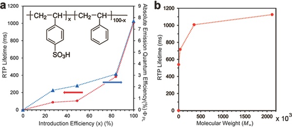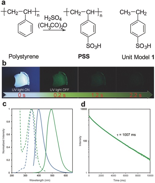 有机室温磷光聚合物在2007年被发现,但其室温磷光寿命比有机小分子短很多。在这个工作中,作者发现简单而常见的无定形聚苯乙烯磺酸,在干燥的状态下具有超长室温磷光寿命,其室温磷光寿命可达1.22秒;除此之外,聚苯乙烯磺酸的室温磷光寿命可以通过调节聚苯乙烯磺酸的分子量和聚合物链上的磺酸基团比例来控制。