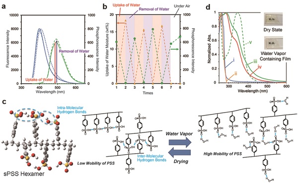 (C)分子模拟的优化结构和干燥聚苯乙烯磺酸薄膜吸收、失去水份磷光过程的示意图