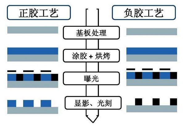 基于光刻工艺的微纳加工技术主要包含以下过程:掩模(mask)制备、图形形成及转移(涂胶、曝光、显影)、薄膜沉积、刻蚀、外延生长、氧化和掺杂等。在基片表面涂覆一层某种光敏介质的薄膜(抗蚀胶),曝光系统把掩模板的图形投射在(抗蚀胶)薄膜上,光(光子)的曝光过程是通过光化学作用使抗蚀胶发生光化学作用,形成微细图形的潜像,再通过显影过程使剩余的抗蚀胶层转变成具有微细图形的窗口,后续基于抗蚀胶图案进行镀膜、刻蚀等可进一步制作所需微纳结构或器件。