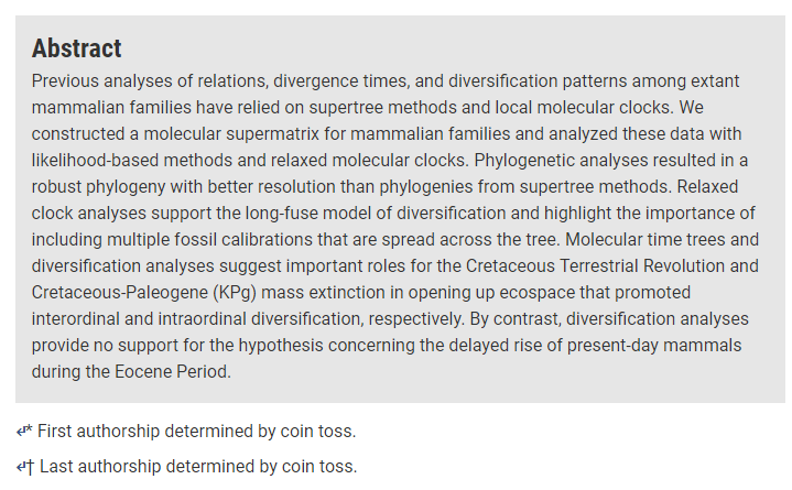 2011年science上发表了一篇题为《Impacts of the Cretaceous Terrestrial Revolution and KPg Extinction on Mammal Diversification》。这篇论文的作者稍微有点多,不过也不算多。不过,作者的排序真的是非常地科学和公平