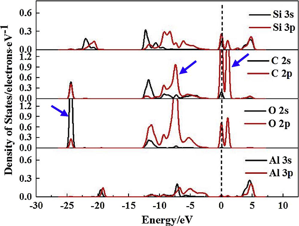 该图显示了CO分子扩散到O空位后Si原子,C原子,O原子和Al原子的电子态。形成了更稳定的C-O键,C-Si键合,Al-O键合。