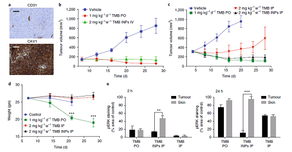 c)每周一次的纳米颗粒或游离药物腹膜内注射(i.p; N = 6)相对于口服每日同等剂量的游离药物的肿瘤生长抑制