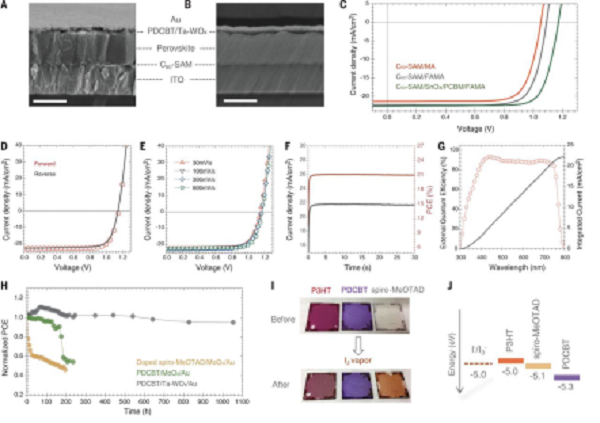 Christoph J Bravec 等人发现,使用Ta掺杂的WOx/共聚物组成的空穴传输层(PDCBT/Ta-WOx)可以形成准欧姆接触,有效降低界面势垒,阻止金属Au迁移,结合使用C60单层自组装膜(C60-SAM)作为电子传输层,可以使得新型的钙钛矿太阳能电池效率可达21.2%,并且可以稳定运行超过1000小时。