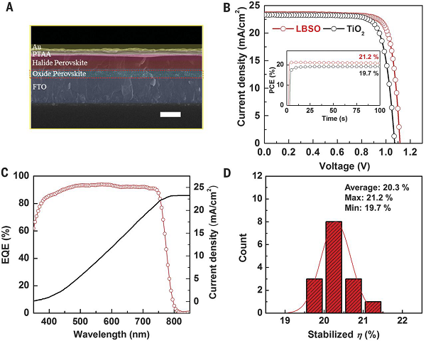 韩国UNIST大学Seok等人使用溶胶法制备了La金属掺杂的BaSnO3钙钛矿电极材料,用于取代传统钙钛矿电池里面的二氧化钛,不仅取得了21.2%的效率,更大大改善了MAPbI3基的钙钛矿电池的光照稳定性。在1000小时的一个太阳能强度下运行,保留了93%的效率。