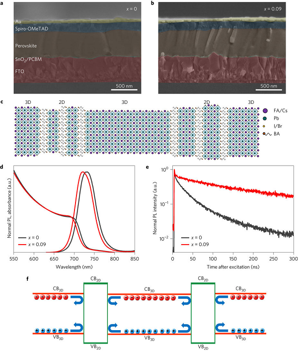 Snaith等人为了克服以上难点,把3D和2D钙钛矿结合在同一薄膜中,形成3D-2D钙钛矿异质结,获得既具有高效光电转化性能(~17%)又具着非常好的室外稳定性。