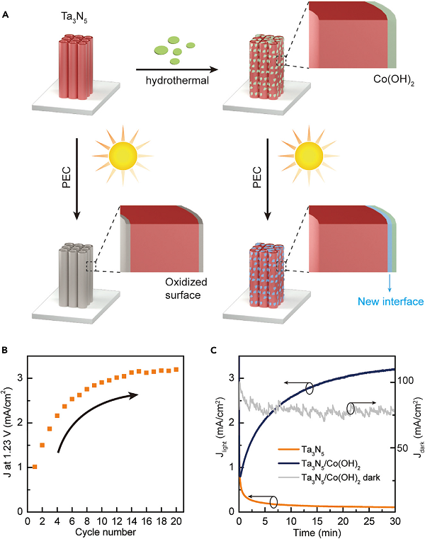 在美国波士顿学院的王敦伟实验室,何昱旻和马培艳等发现在氮化钽纳米管阵列上通过水热的方法沉积氢氧化钴(Co(OH)2)纳米薄片能有效提高氮化钽光氧化水的光电流密度以及稳定性。氮化钽本身在光氧化水条件下极不稳定,与此同时光电流密度会快速下降。恰恰相反,在沉积了氢氧化钴纳米薄片后,氮化钽的光电流密度随着光氧化水的时间增加而提高并趋于稳定。在此基础之上,沉积另一种高效的氧化水催化剂(Co-Pi)可以进一步提高光电流密度。当没有光照的情况下,这种不同寻常的现象不会发生。对于氮化钽和氢氧化钴间界面的研究进一步表明,一个光诱导形成的界面减弱了费米能级钉扎效应,从而改善了光激发电子-空穴对在表面的复合,与此同时加快了光空穴的传导,从而减少了自氧化副反应的发生。这个界面被解释为在光氧化水过程中产生的氧自由基引导生成的Ta-O-Co键。这个发现表明了利用催化剂与半导体间的反应来提高光催化剂性能的可行性。