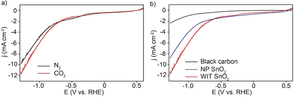 a. 分别在N2和CO2饱和溶液中WIT结构SnO2的LSV结果;