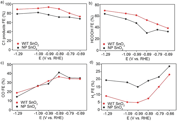 图五. NP SnO2和WIT SnO2电催化产物的法拉第效率(FE)