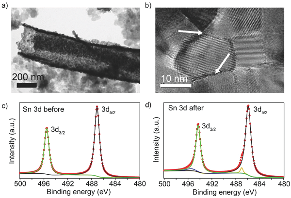 c-d. WIT结构SnO2的STEM表征及元素分布;