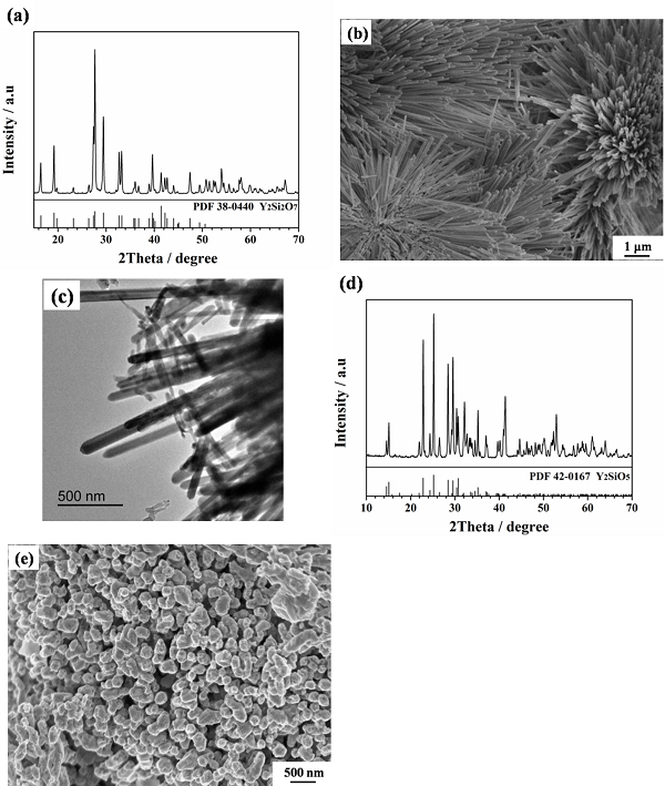 a-c. β-Y2Si2O7纳米线(β-Y2Si2O7 NMs)的XRD/SEM/TEM表征;