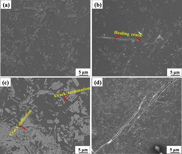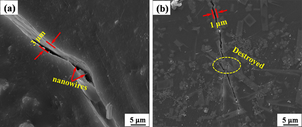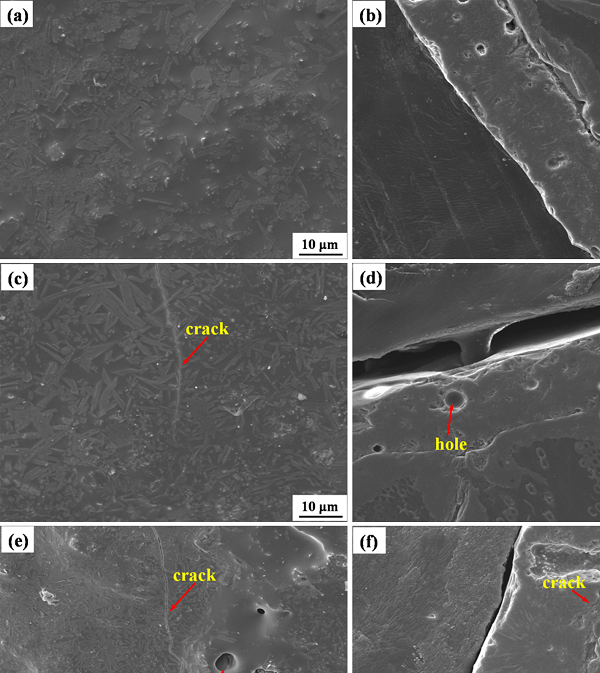 图八. 包覆YAS玻璃陶瓷层和未包覆的样品50次室温—1673K热循环之后的SEM表征