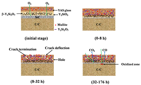 图十二. β-Y2Si2O7 NMs- Y2SiO5/YAS玻璃陶瓷膜包覆的SiC-碳/碳复合材料氧化机理