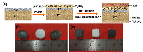 图二. 制备β-Y2Si2O7 NMs- Y2SiO5/Y2O3-Al2O3-SiO2(β-Y2Si2O7 NMs- Y2SiO5/YAS)玻璃陶瓷层的步骤及不同形貌样品照片