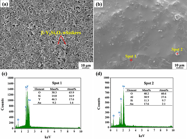 a-c. β-Y2Si2O7 NMs- Y2SiO5的断面SEM表征及EDS分析;