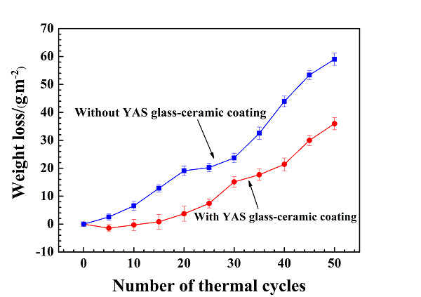 图七. 包覆YAS玻璃陶瓷层和未包覆的样品室温—1673K热循环之后,质量变化曲线