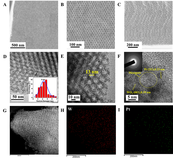 (D-F)有序介孔WO3/Pt 透射电镜图片,D插图为Pt颗粒粒径分布图,F插图为对应的电子衍射花样;