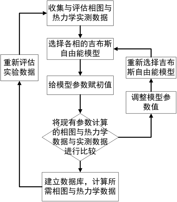 相图计算的实质是根据目标体系中各相的晶体结构、磁性有序和化学有序转变等信息,建立起各相的热力学模型,并由这些模型构筑各相的吉布斯自由能表达式,最后通过平衡条件计算相图。其中,各相热力学模型中的待定参数根据文献报导的相平衡及热力学性质数据并借助于相图计算软件优化获得。在所获得低组元体系(一般为二元和三元系)热力学参数的基础上通过外推或者添加少量的多元参数可获得多元体系的相图和热力学信息。