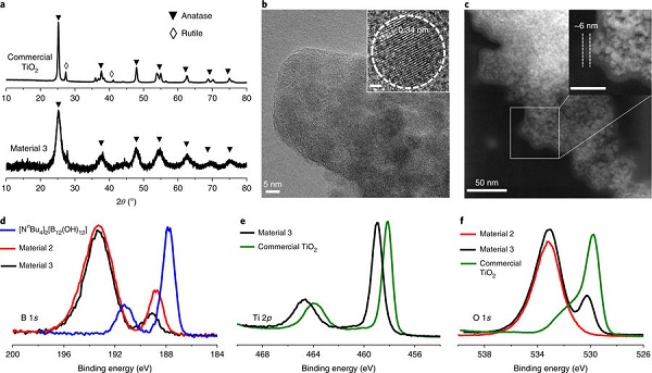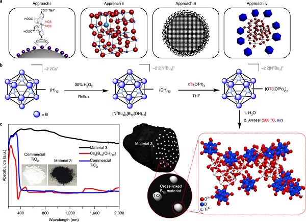 近日,加州大学伯克利分校的Alexander M. Spokoyny (通讯作者)等人在Nat. Mater.上发布了一篇关于金属氧化物的文章,题为“A molecular cross-linking approach for hybrid metal oxides”。作者创新的通过“分子交联”法成功地对金属氧化物进行了改性。其中混合分子氧化硼材料由多面体硼簇前体形成,这种新方法由硼簇分子结构单元固有的坚固性所支持的,该结构与金属氧化物合成所需苛刻的热学和氧化条件相容。文中,作者利用一系列实验技术和材料模拟手段,展示了这种材料如何与TiO2和其他金属氧化物成功对接,从而制备出了具有优异光物理和电化学特性的富硼杂化材料。