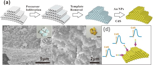 (a) 340nm大孔尺寸的3DOM TiO2, 3DOM TiO2-Au,3DOM TiO2 -Au-CdS 的反射光谱;