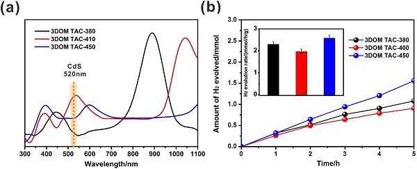 (a) 反射光谱和 (b) 3DOM TAC-380, 3DOM TAC-410,3DOM TAC-450的产氢性能;