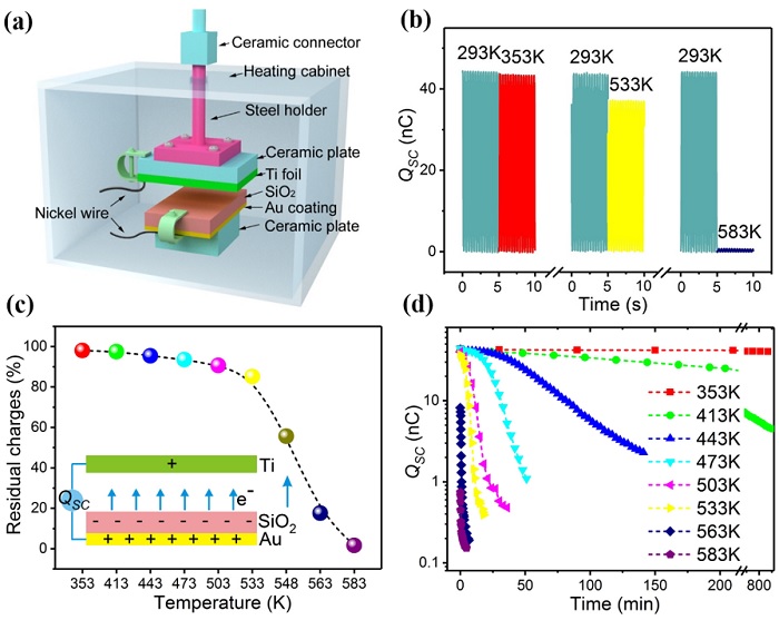 接触起电(摩擦起电)发现于古希腊时代,是一个古老和有趣的现象。虽然距今已有2600多年历史,但是有关接触起电的原理仍存有很多争论。其中最重要的是,在起电过程中,电荷转移是通过电子还是离子的转移来实现以及为什么产生的电荷可以长时间保留于材料表面。金属与金属之间或是金属与半导体之间的接触起电,通常认为是产生了电子转移,并可以通过功函或接触电势的不同来解释。而通过引入表面态的概念,电子转移理论也可以在一定程度上解释金属与绝缘体之间的接触起电。但是,离子转移也可以用来解释接触起电,并且更适用于含有聚合物的起电体系,例如其中的离子或官能团主导了起电现象的产生。迄今为止,仍未有一种令人信服的理论能够用来揭示接触起电的主导机制究竟源于电子还是离子转移。值得注意的是,几乎所有的与接触起电有关的研究都集中在产生的电荷总量上,而很少有关于表面静电量变化的实时探测或与温度相关的研究,而这很可能是解决上述问题的关键。王中林院士基于麦克斯韦位移电流原理提出的摩擦纳米发电机(Triboelectric nanogenerator,TENG)技术,可以精确的表征表面电荷密度,并可以实现不同温度下的应用,这就为解决上述接触起电中的难题提供了一种新思路。