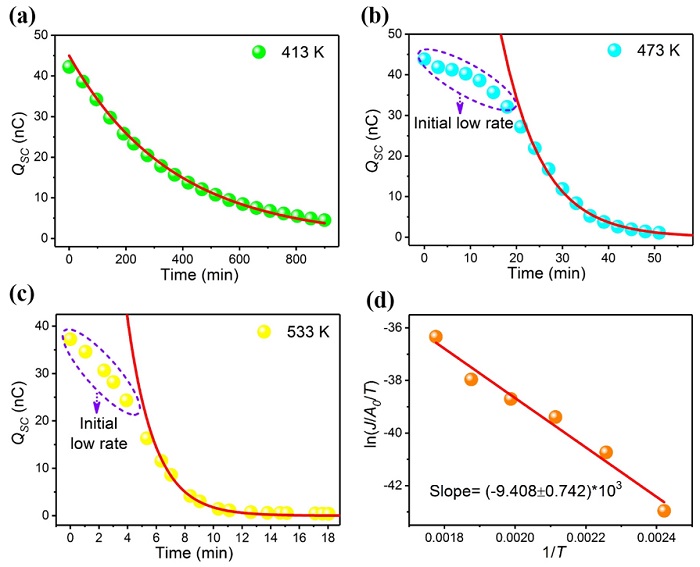 a-c) 短路转移电荷在不同温度下随时间的变化;