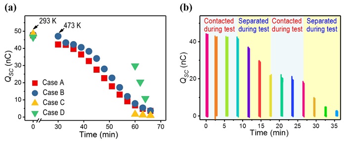 b) 473 K温度下在测试过程中钛箔与SiO2接触或分离导致的短路转移电荷随时间的变化。