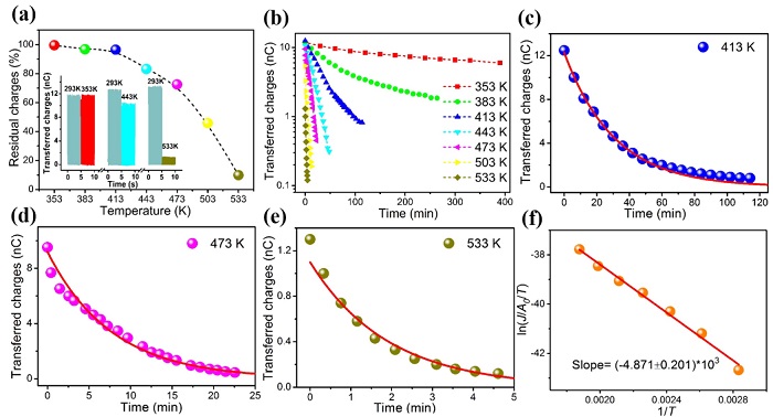 a) 不同温度下TENG的残余电荷百分比,插图是不同温度下的短路转移电荷;