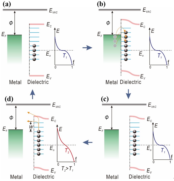 d) 放电状态。Φ,金属的功函;EF,费米能级;EVAC,真空能级;EC,导带;EV,价带;En, 表面态的中间能级;f(E),费米狄拉克分布函数;W,势垒;T1和T2,温度。
