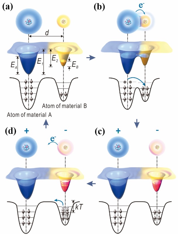 a-c) 两种不同材料的原子的电子云和势阱(三维和二维图)在接触起电前、起电时和起电后的状态;d) 在较高温度下的放电状态。d,电子云间的距离;EA和EB,电子的占据能级;E1和E2,电子逃逸所需的势能;k,玻尔兹曼常数;T,温度。