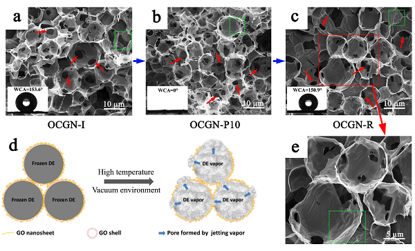 c)通过焦耳热恢复后OCGN的SEM图像和疏水角;