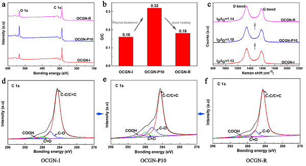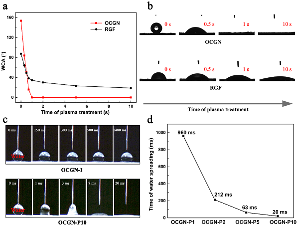 a)等离子体处理时间与OCGN及还原石墨烯膜(RGF)表面接触角关系;