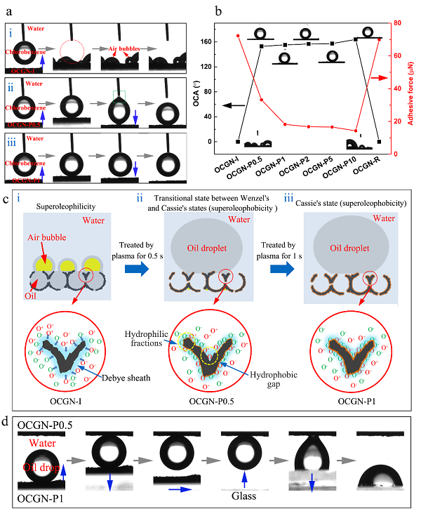 b)不同OCGN对水下油滴的接触角与黏附力;