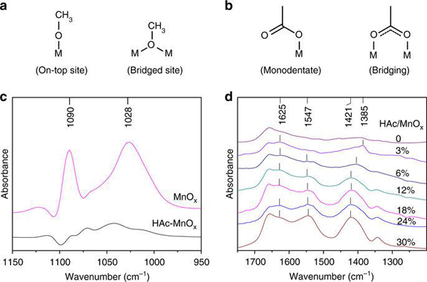 c)CH3OH吸附到未改性和HAc改性的MnOx的FT-IR光谱;