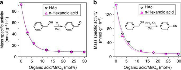 b)在苯甲醇氨氧化过程中MnOx的质量比活性与有机酸/MnOx的比值。通过电感耦合等离子体原子发射光谱分析Mn含量。