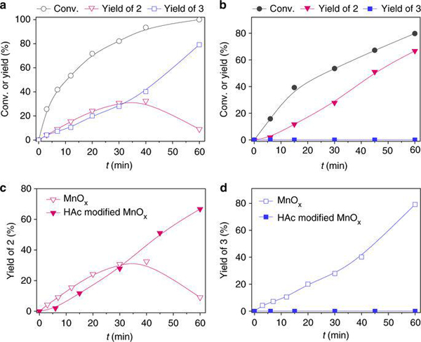 d)分别在MnOx和HAc改性MnOx上形成3的时间过程。