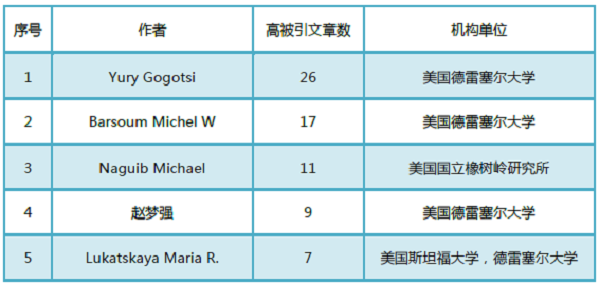 从发文作者以及研究机构单位数据图可以看出,MXene材料领域的研究以德雷塞尔大学的研究为主导,其中Yury Gogotsi、Barsoum Michel W以及赵梦强等研究人员均来自德雷塞尔大学,Yury Gogotsi教授从2007年开始到2016年这十年间发表超过百篇文章,其中包括论文、综述、专著等多种形式;国内的主要研究机构有中国科学院宁波材料研究所、河南理工大学、陕西HTH官网地址 大学以及燕山大学等,其中周爱国教授、王李波教授等均来自河南理工大学,为国内研究MXene材料做出了显著的成绩。其中,以Yury Gogotsi教授的文章为主,受到了世界范围研究者们的关注,他的高引用文章数多达26篇,同时德雷塞尔大学多位研究者的工作合计有超过50篇为高被引文章,说明了他们的MXene领域领头羊的地位,另一方面,也是世界各地MXene领域科研人员对德雷塞尔大学相关研究者研究工作的一种认可。