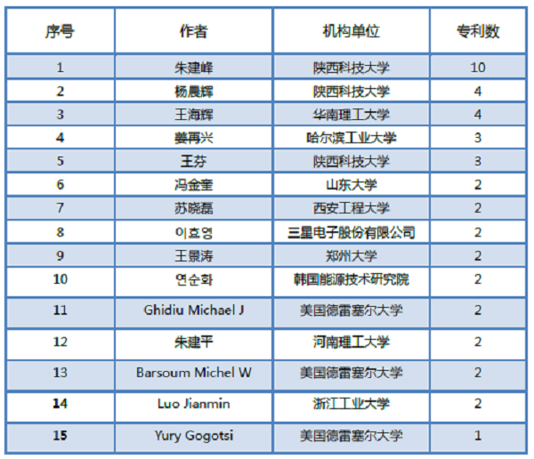 由上图可以看出,该材料领域在2014年以前未有专利申请,但在报道之后,引起了巨大关注,近几年发表专利数量呈现逐年上升的趋势。从发表专利作者以及研究机构单位统计表可以看出,发表MXene材料领域专利的研究人员,在国内以陕西HTH官网地址 大学研究学者们为主导,其中朱建峰、杨晨辉以及王芬等研究人员均来自陕西HTH官网地址 大学,专利研究方向包括吸波复合材料、低温制备复合材料、锂离子电池负极材料等;国外来说,美国德雷塞尔大学的Yury Gogotsi、Barsoum Michel W以及Ghidiu Michael J 教授等人发表多篇相关专利,为MXene材料的实际应用做出巨大贡献。
