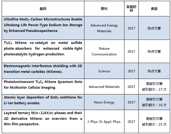 上表统计了几种影响因子和行业内知名度较高的几种期刊发文情况,可以看到,近年间MXene材料发表高质量文章的数量还是很可观的,在材料领域的高水平期刊Advanced Materials、ACS Nano、Nano Energy等期刊发表文章数超过50余篇,说明MXene材料的研究正处于较高水平的快速发展中,其研究的可行性也逐渐得到了认可;另外,在多种应用领域的频繁发文也说明了MXene材料越来越受到各领域的重视,其应用也愈加广泛。这种新型材料的研究与应用方兴未艾!