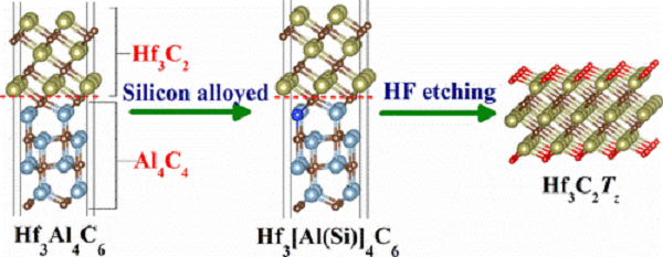 MXenes的制备主要是通过HF酸,NH4HF2溶液,LiF及HCl混合溶液及低共熔混合盐介质中对A位为Al的MAX相材料中的Al原子选择性刻蚀而得到。由于过渡金属Zr及Hf难以形成A位为Al的MAX相,因此,截止目前,关于Zr系及Hf 系的MXenes材料仍未见报道。相比于Zr系材料,Hf系层状碳化物更难获得单一的物相,研究人员基于固溶法调谐单胞内亚层的思路,在Al位引入少量Si,采用SPS方法合成了新型固溶体材料,以此固溶体为前驱体,以HF酸为蚀刻剂,实现了对Al(Si)-C结构单元的选择性剥离,首次获得了Hf系二维MXenes材料;借助结合能和原子电荷计算分析,阐明了Si掺杂促进氢氟酸剥离过程的微观机制。Hf系新颖二维碳化物材料在储能、吸波和光电器件上有着潜在的应用,高体积比容量材料有望应用于发可应用于空间飞行器、移动装备等小型化供能系统中。