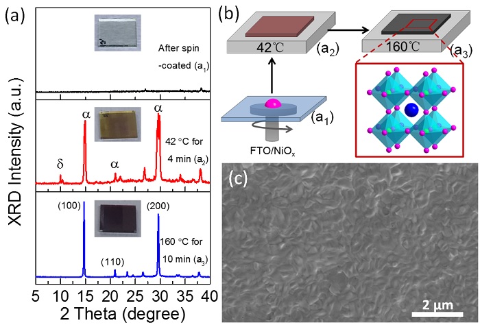 通过精准的控制薄膜退火过程,监控薄膜在两步控温过程中的生长动力学过程,制备出高致密、全覆盖的钙钛矿薄膜。