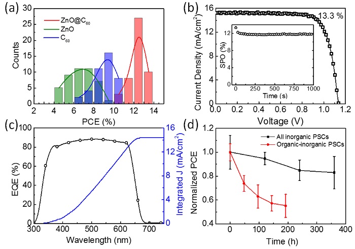 该研究工作制备了高质量的CsPbI2Br无机钙钛矿薄膜,并在此基础上提出了ZnO@C60双电子传输层,有效的增强了电子的萃取能力,并且降低了界面的缺陷态密度,提升了全无机钙钛矿太阳电池器件的效率。此外,该工作提出的全无机钙钛矿太阳电池相较于传统的有机-无机杂化钙钛矿太阳电池表现出更优的热稳定性。该研究工作为进一步解决钙钛矿太阳电池的稳定性问题提出了新的思路和方法。