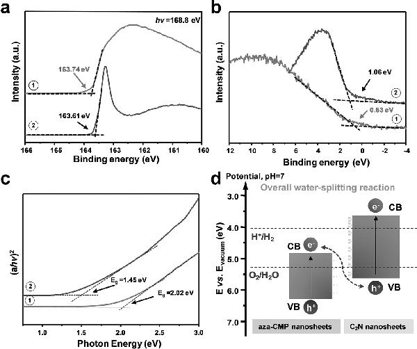d)导致Z型光催化结构的aza-CMP和C2N纳米片的电子能带结构