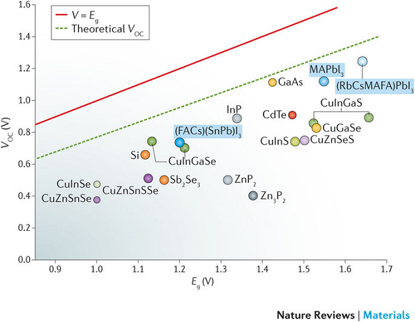该文为最新发表在science的钙钛矿电池的综述文章,其着重分析了当今钙钛矿电池的发展现状和重大存在问题。该问题提出两大重要方向。其一,未来需要进一步提高钙钛矿电池的电压来提高电池效率。其二是,未来要系统研究钙钛矿电池材料降解机理,以找到提高钙钛矿电池器件稳定性的办法。