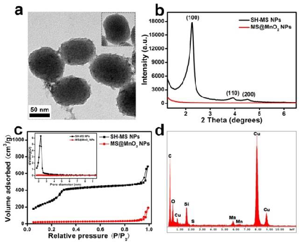 (a) MS@MnO2 NPs和SH-MS NPs(插图)的TEM图像;