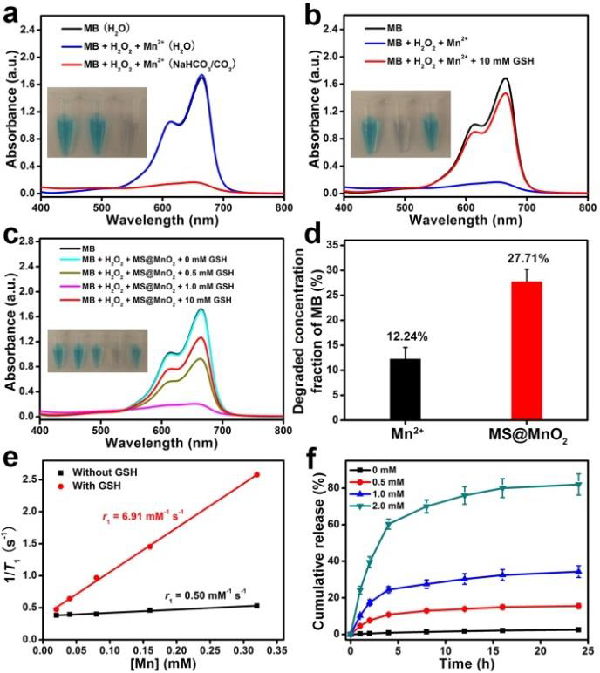 (e) 有无GSH条件下MS@MnO2 NPs的r1值;