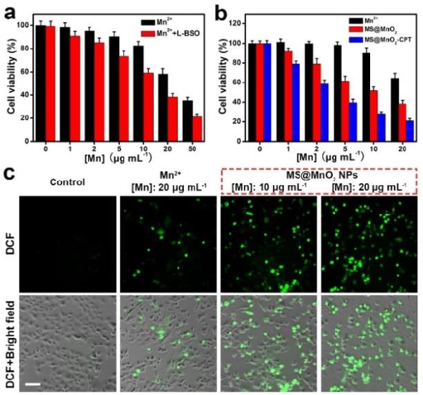 本文首次制备了一种基于MnO2自增强的CDT纳米药物,在消耗GSH后,其产生的Mn2+可以发生类Fenton反应。在生理HCO3-作用下,Mn2+能更多的将内源H2O2转化为活性较强的•OH,达到杀死肿瘤细胞的目的。在内部包载CPT后,GSH也能引发内部的CPT释放,在解离MnO2的同时,增强其T1成像,达到诊疗一体的目的。