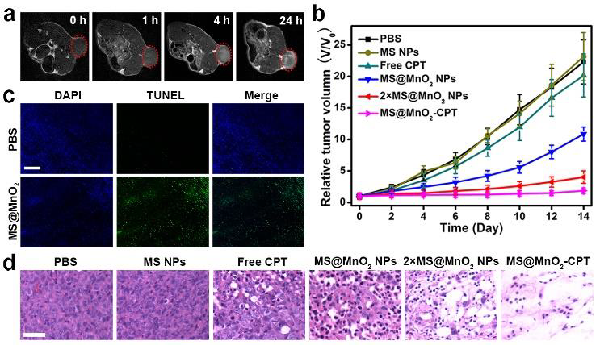 (a) 注射MS@MnO2 NPs后不同时间的T1加权成像(红色指示肿瘤);