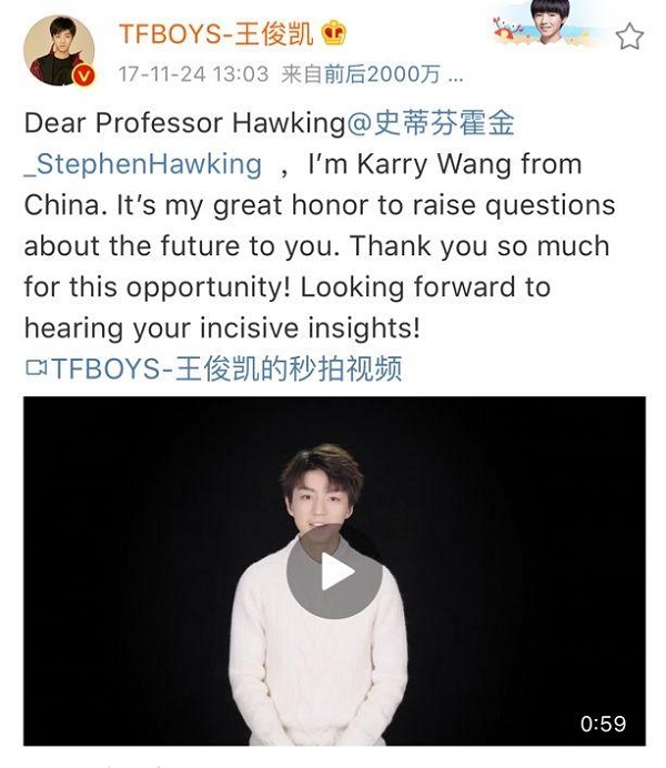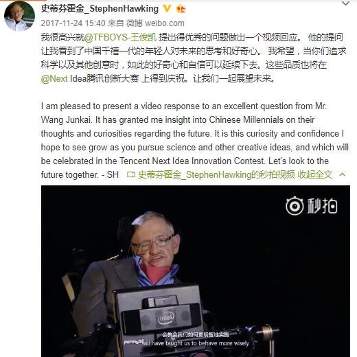 对此,霍金专门录制了视频回复了王俊凯,并就王俊凯提问中的主要问题进行了回答。