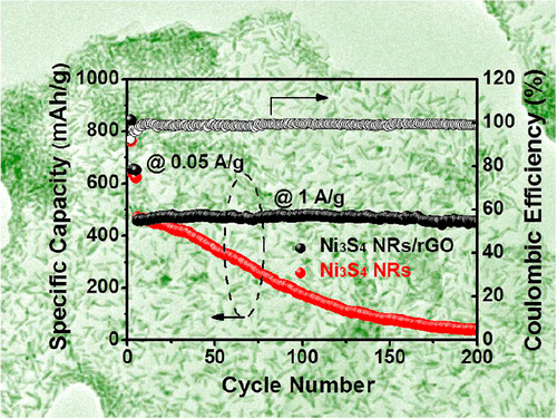 虽然主张作为当前锂离子技术的潜在低成本替代品,但钠离子电池的实际可行性仍然是虚幻的,并取决于高性能电极材料的发展。目前可用的候选材料很少能够同时满足容量,速率能力和循环寿命的要求。近日,苏州大学李彦(通讯作者)团队报道了一种高温溶液法制备尺寸均匀的Ni3S4纳米棒。这些胶体纳米棒容易自组装,并形成微观的超结构,这不幸地否定了单个纳米棒的纳米级特征。为此,进一步引入二维石墨烯纳米片作为间隔物来中断纳米棒自组装。合成的复合材料在Na+的电化学储存方面具有明显的优势。证明在半电池中它表现出超过600mAh/g的大的可逆比容量,高速率能力,保持在4 A/g时> 300 mAh/g,并且在不同电流速率下循环寿命长。